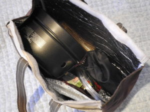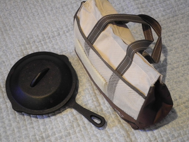 スタッキングねたも佳境、今回はちょっと自慢というか今一番個人的に楽しんでいるパッケージを紹介。見ての通り、小さめのクーラーボックスのようなトートバックに、ϕ20cmのスキレットのフタ付きのセット。これらを、車中泊、キャンピングカーにかかわらず持ち歩いている。