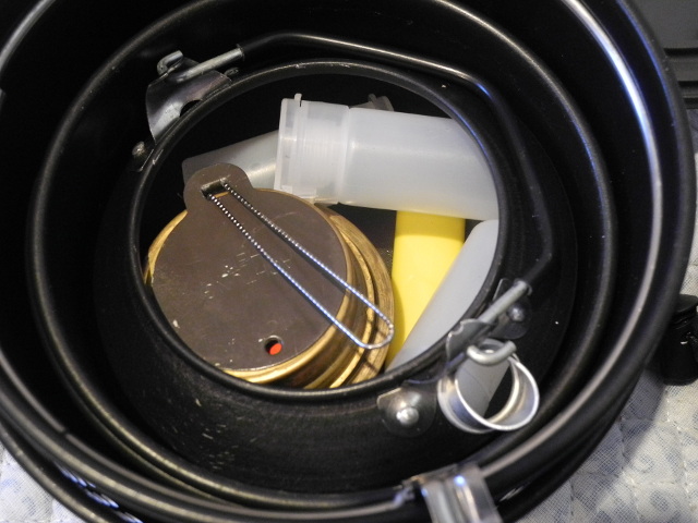 コンロの熱源は基本がアルコールストーブ。フタに見える消化用キャップにより弱火にも設定できるところが優れているところで、それをやりやすくするために簡単な取っ手を取り付けた。もちろんその燃料となるアルコールも、小分けにしてヤカンの中にライターと同時収納し、いつでも使えるようにしている。