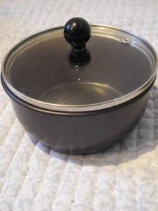 標準ではフタがないので、オプションとして取り扱われているプラスチック製のフタも内包させ、それはまな板や水切りにも使える。さらに米を炊きたいという日本的な事情から、直径の合いそうな重めのガラスフタを用意し、取っ手を小型のものに付け替えフタの口に当たる部分を地道に絞って鍋の口に入るように細工した。