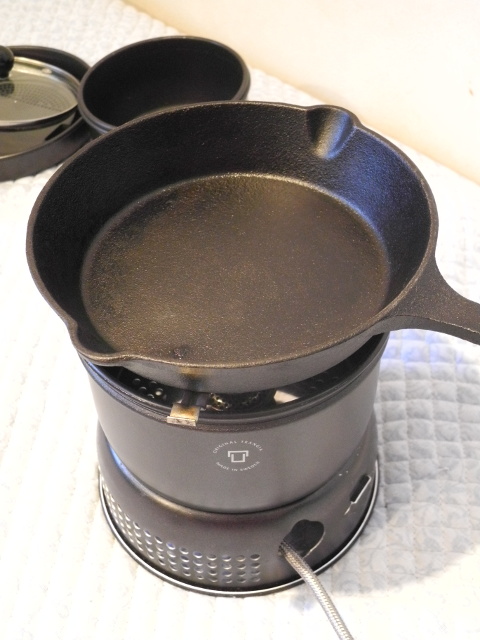 これまでのアルコールストーブを使っても、弱火から中火で30分以上の加熱が余裕でできたのだが、ガスカートリッジのガスボンベを利用することで、より簡単に熱源を長時間利用できるようになった。なので、付属の樹脂コーティングのフライパンではなく空焚きにも圧倒的な耐久力のスキレットを載せっ放し、火を消すこともなく延々と焼き物が楽しめるようになり、呑んべいにとっては幸せの極みである。