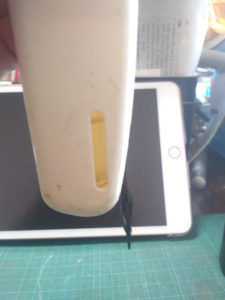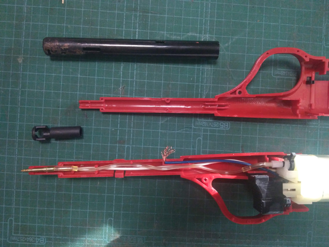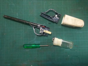 それはさておき早速分解。見ての通りである。それほど構造は難しくは無いが、製造年などで構造もだいぶ違うようなので、不安な人は写真などを撮っておくといいだろう。この商品の場合ネジ留めは1箇所のみで、あとははめ込み式だった。