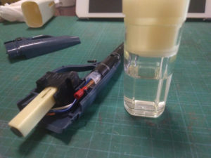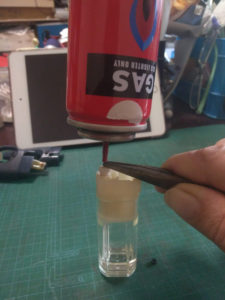 そこでバルブ周りのパーツを外し、バルブが外れない、ガスがダダ漏れしない程度に緩め、中のパイプを可能な限り引き出し市販のライター用ブタンガスを注入。正直言って、相当コツが必要です。初めてやる場合、なかなか上手くいかないかも。