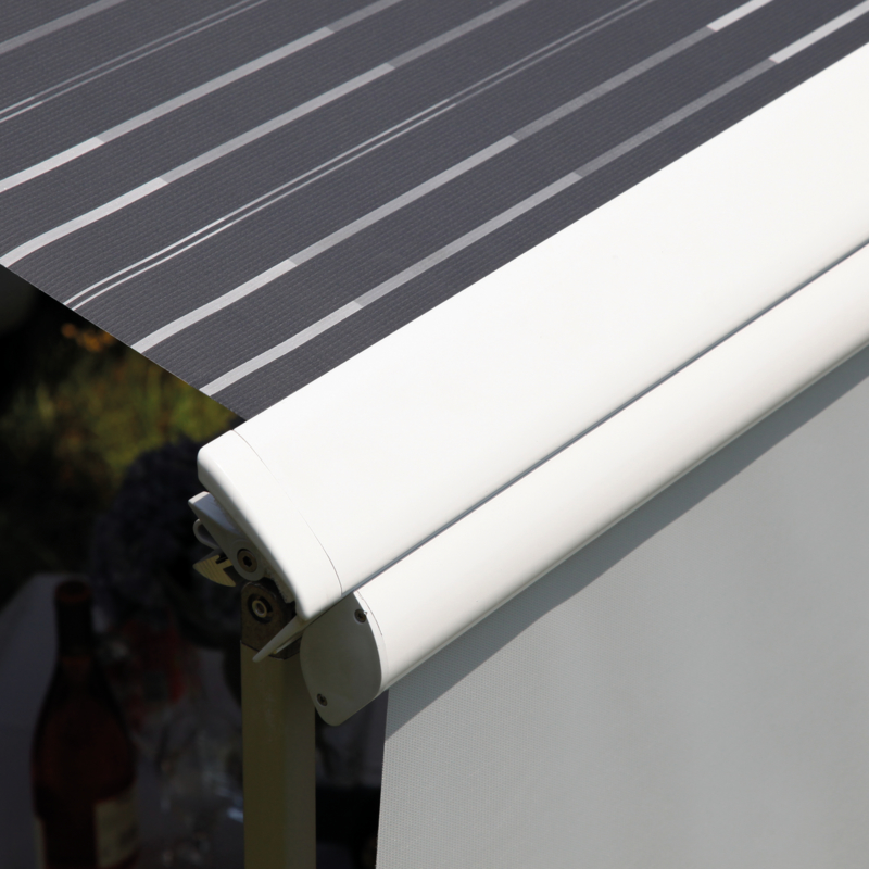 ●フィアマ製サイドオーニングの前面に取り付けるブロッカーPROは、窓を設けることで開放感があります。耐久性の高い生地を使い、風よけとともに日差し除けに役立ちます。