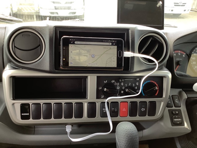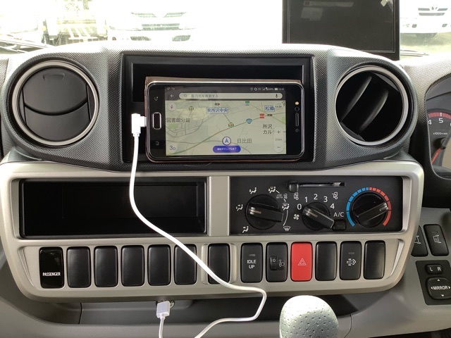 実際走り出しても、載せているだけにもかかわらず相当な揺れにも落ちたりズレたりはしない。問題は電源供給コードの形状である。普通のストレートだと結構ハンドルやシフト操作に邪魔になってしまうことが多い。それだけハンドル周りのスペースがタイトである事は間違いない。