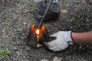 今回は着火状態を統一するため着火剤2欠けとし、それに火を点けてから炭を上に載せていった。割ときつめに詰めていっても、底面と側面には空気取り入れ口が開いているので、かなり強力な炎が立ち上り、炎は炭に続々と移っていく。