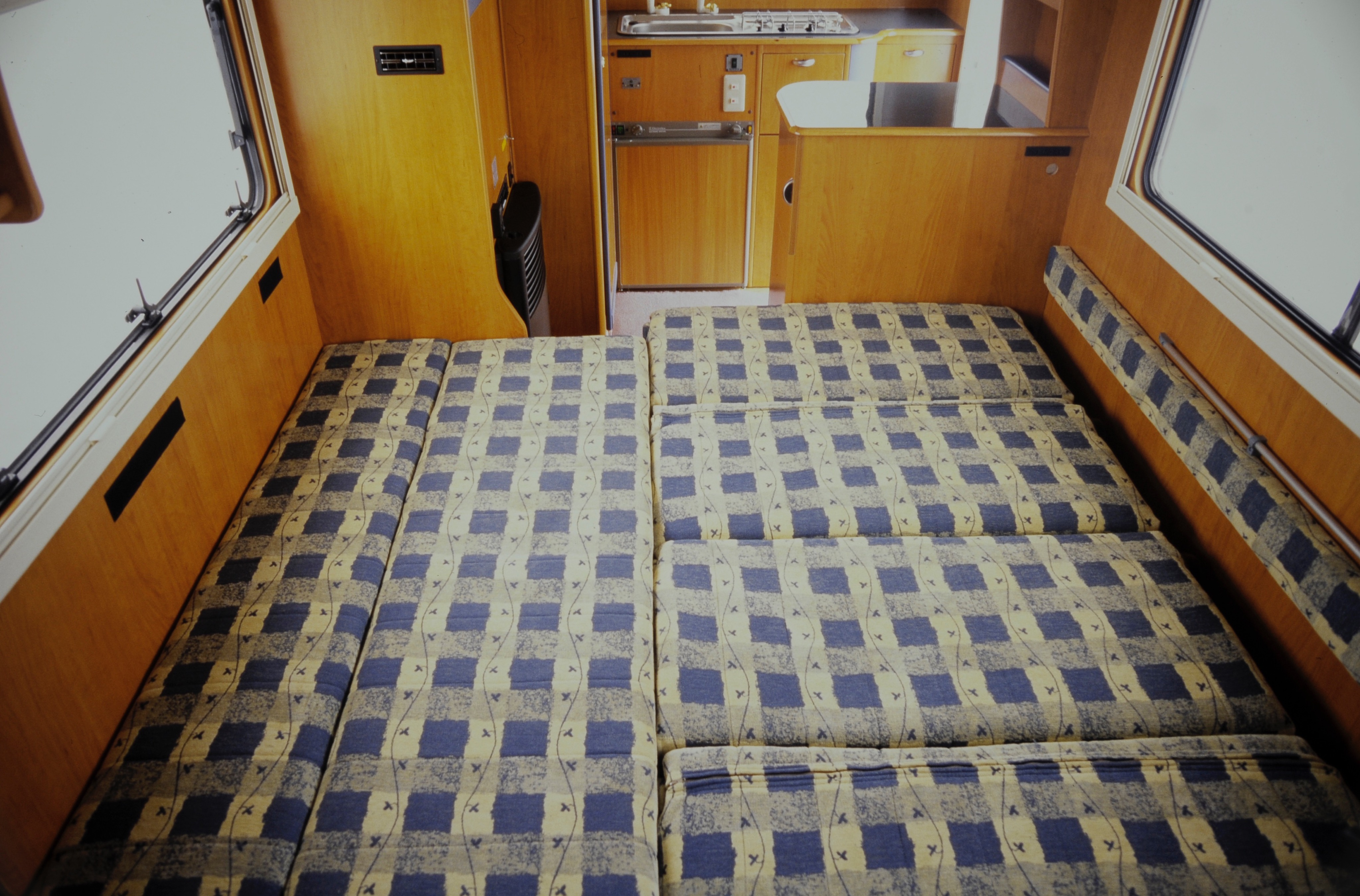 ダイネット空間は、ジル同様全面ベッド展開が可能。マットの境目のフラット感も高く、バンクと合わせると余裕で大家族に対応できた。対面ダイネットを展開せず、掘りごたつ状態で利用するのがユーザー層に定着したのもこの頃である。