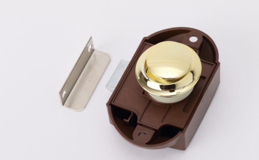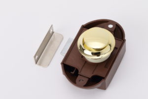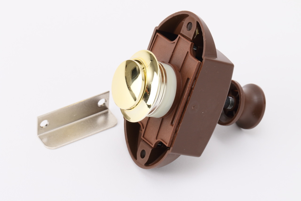 ●金色のノブのプッシュロック。取り付け可能な板の厚さは15~17mm。φ25mmの穴開けが必要です。サイズ:78×53×58mm