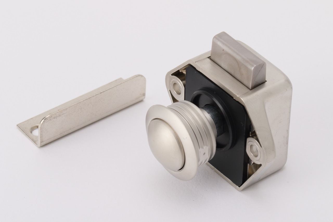 ●シルバーで小型タイプのプッシュロック。取り付け対応板厚は11~17mm。φ20mmの穴を開けて取り付けます。サイズ:48×35×52mm