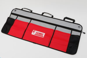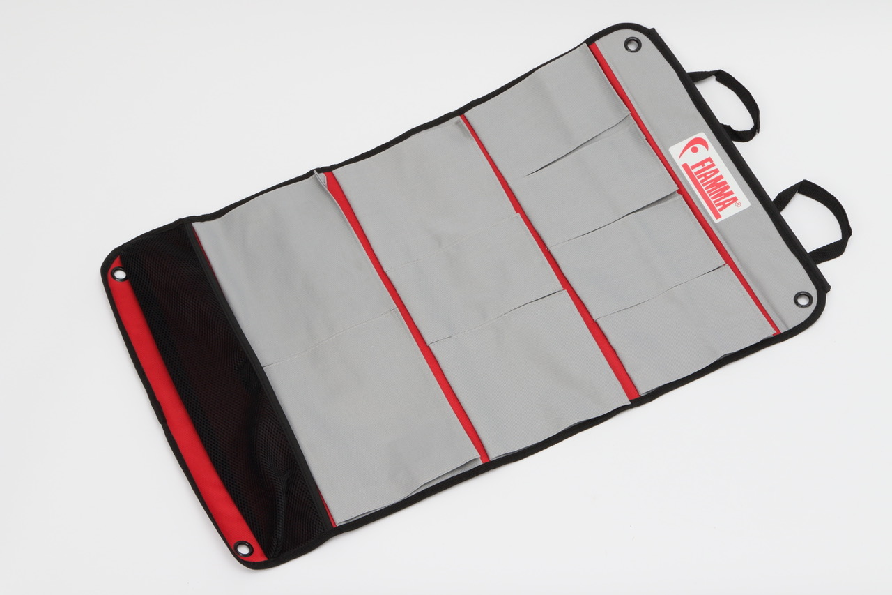 「フィアマFIXオーガナイザー2P(♯023130)」は、フィアマ製のバッグやオーガナイザーを吊り下げて使用できるようにするフックです。主に車外で使えるようにするためのもので、あらかじめボディ外装などにビスで固定しておきます。たとえばサイドオーニング下にテーブルやイスを出してくつろいでいるときに、外装にバッグを吊しておき、車外でよく使う物を入れておけば、いちいち車内に取りにいく手間が省けて便利。フィアマFIXオーガナイザー2Pを取り付けることができれば、そこが収納場所に早変わりします。