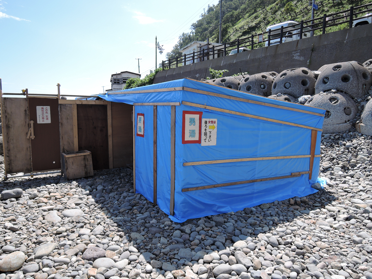 もともとは、地元漁師が昆布漁で冷えた体を温めるために使用されてきましたが、地元の方の管理によって6月~9月中旬はシートで小屋掛けされ、観光客にも無料で開放されています。小屋が設置されている期間は男女別の更衣室が使用でき、湯船も男女に分かれているので、夫婦やファミリーでも安心して入浴できます。