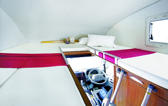 フロントシート上にあるバンクベッドは、通常とはかなり違う折りたたみ式ツインベッド仕様。横に寝ている人に気を使うことが少なく、フロントシートからマルチルームやリヤダイニングスペースへの移動がすこぶる楽な移動になるよう設計されている。