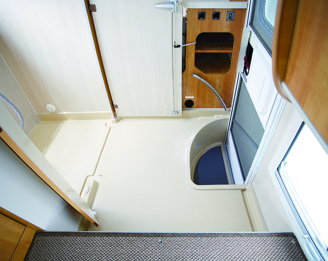 また、このエアコンの下スペースは一段高い設定になっていて、キャブとシェルの高さ段差をかなりの床面積で吸収している。その横側面下部にはウインドウが付き、ワンちゃんが外を眺めていられるという嬉しい特典付き。さらにそのスペースは、ちょうどワンちゃんが移動中に中央から前を見るのにいい位置になっているのも見逃せない。