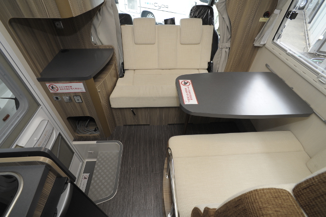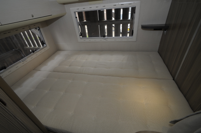 ダイネットが全体で20cmほど前方へ移動、それとともに後方が20cm拡大したことにより、最後部にダブルベッドを設置することができた。狭さを感じずにすむ2段ベッドではなく、3段階にスプリングの反発力を調節できるマットを入れ、寝る方向で2つに分割されているおかげで、隣で寝ている人の寝返りが直接伝わらないようにも工夫した。