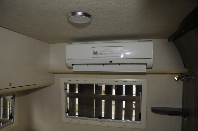 その就寝スペースには、今やバンテック車には当たり前になりつつあるセパレートエアコンの室内機が装備され、サブバッテリーで4時間程度は駆動できるように。もちろん出力的に、フロントのバンクベッドの空間まで調節できる能力があるが、例えばこのリヤ空間だけをカーテンで仕切って空間容積を減少させれば、その運用エネルギーは減少しサブバッテリーへの負担も激的に軽減させることができるだろう。
