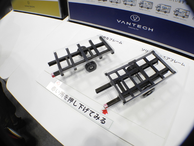 さてキャンピングカーの場合、前述のメインシャシーとは別にシャシーといえば載せる箱、居住部分のシャシーの話になる。最近のバンテックでは色々なキャンピングカーの話を模型などを使いわかりやすく説明するブースをショー会場で行なっているが、その中にもシャシーの話は重要項目として取り上げられている。