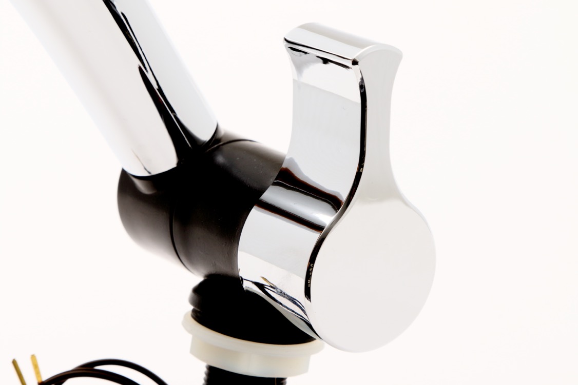 「シングルフォーセットstyle2005」は、高さ230㎜、クロームメッキされていて高級感のあるフォーセットだ。マイクロスイッチを内蔵していて、右側にあるツマミを動かすことで水ポンプのオンオフができる。フォーセット部分は上下に可動するので使わないときは下側に向けて折りたためるので邪魔にならない。
