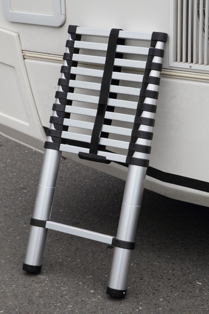 車のリヤに昇降用ラダーを装備しているのならば、ルーフ上に乗って作業ができるが、たとえば、バンクベッド部分に装備しているウインドウの修理、サイドオーニングの掃除などボディ側面の高い位置のメンテナンスではハシゴが必要になる。