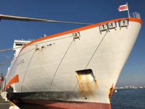 展示車両のZILです。この後フェリーに載せますが、行くのは車だけです。フェリーに揺られ、2日間かけて九州へ向かいます。正直、私も行きたいです。フェリーでゆっくりと海をみながら旅気分で。あまりの天気の良さに、つぶやきましたが、疲れていますねー!! 船を見ながら防波堤で黄昏れていました。そんな時もありますよねー!!